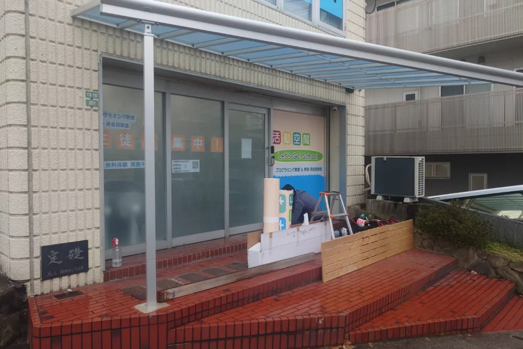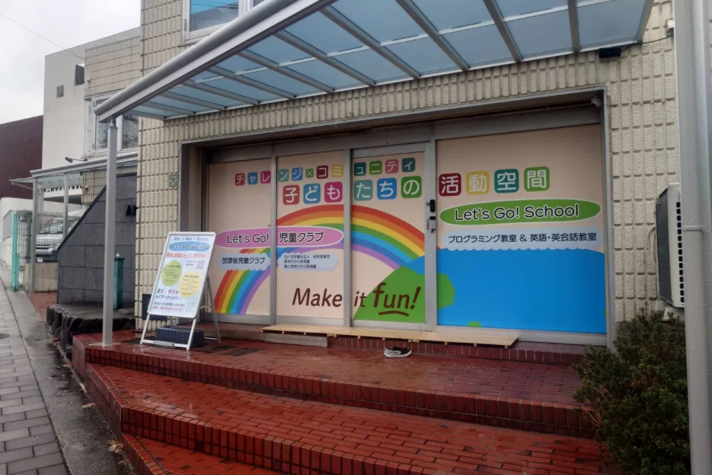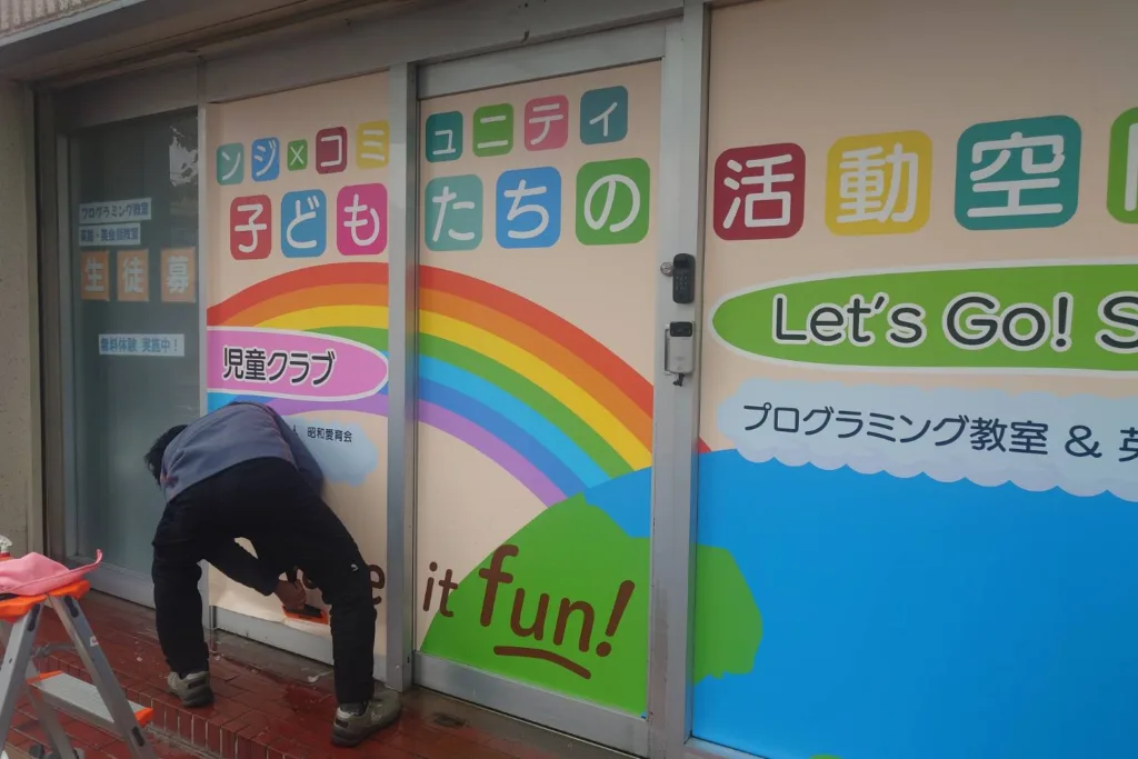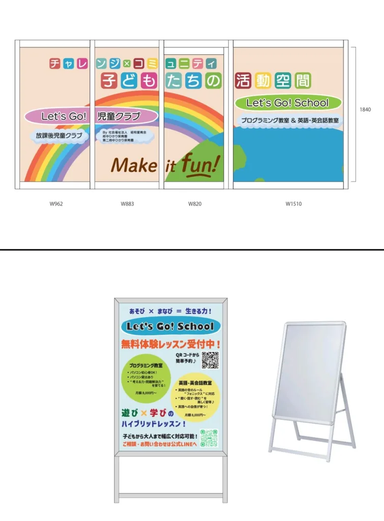 府中町の Let’s Go! 児童クラブ&Let’s Go! Schoolさまのウィンドウグラフィックと立て看板を、デザインから施工まで担当させていただきました。